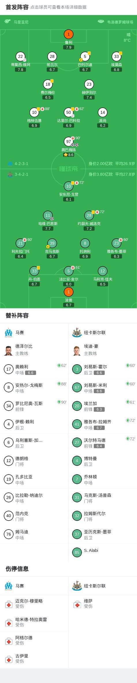 比赛开始后不久,巴恩斯在禁区内低射得手,为纽卡斯尔联取得领先。下半场刚开始,奥巴梅扬成功突破波普的防守,打入空门,将比分扳平。紧接着,蒂莫西-维阿突破传中,奥巴梅扬抢点破门,完成梅开二度,马赛反超比分。