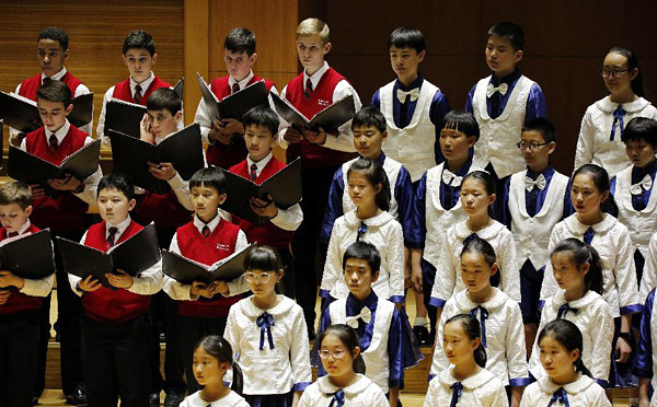 4月20日,美国男童合唱团成员与北京朝花艺术团的孩子一起表演合唱。当日,来自美国的著名合唱团队美国男童合唱团中国巡演音乐会在北京音乐厅举行。