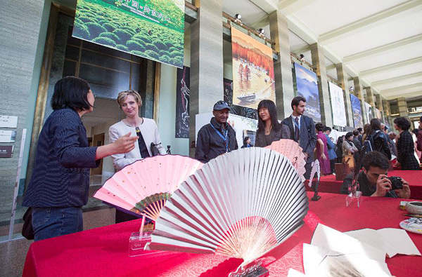 4月19日,在瑞士日内瓦,来宾参观“美丽中国·诗画浙江”主题展览。联合国日内瓦办事处19日举办“美丽中国·诗画浙江”主题展览,在联合国中文日呈现来自中国浙江的诗画之美。