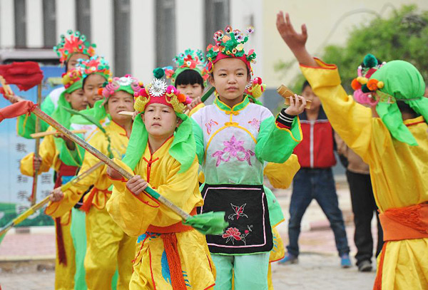 4月20日,河北南皮县大浪淀乡白塔寺中心小学学生在排练落子。落子是河北沧州一带具有浓郁地方特色的民间舞蹈,已有150多年的历史,2008年被列入第二批国家级非物质文化遗产名录,在沧州市南皮县最为盛行。 2009年起,南皮县文体教育部门将学习落子列入中小学生的校本课程,在全县100多个中小学及教学点组织落子教学。通过校园“传薪”,如今南皮不少学校学生表演的落子已颇具功力。